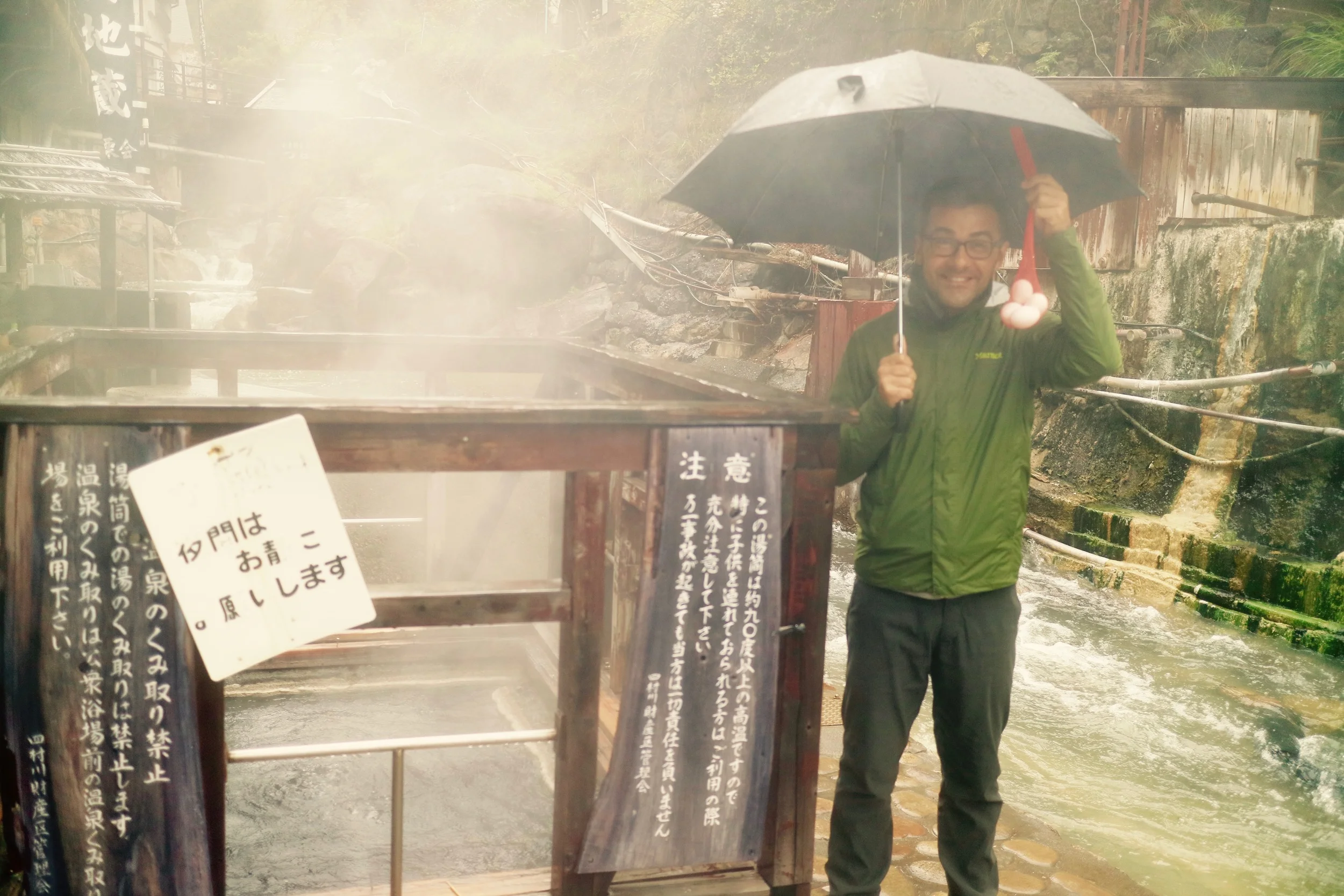 We're out the door early this morning, as good pilgrims are. We cross the road with our bag of eggs and two umbrellas in hand to the hot water spring. 6 minutes later — soft-boiled perfection fulfils an ancient tradition and back across the road and in the door we go, to feast of our steaming hot eggs and a traditional Japanese breakfast.